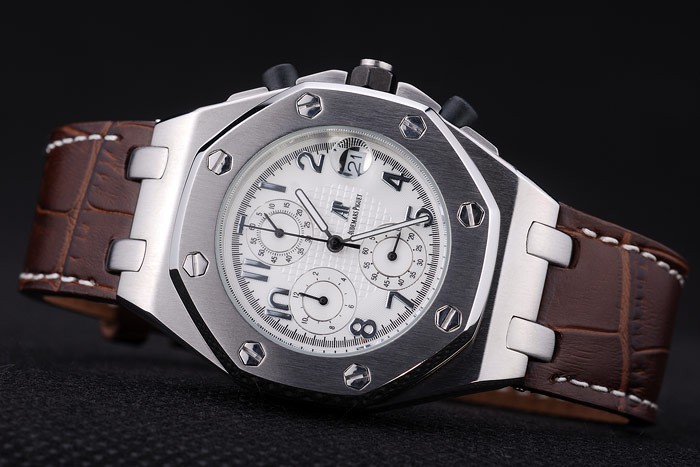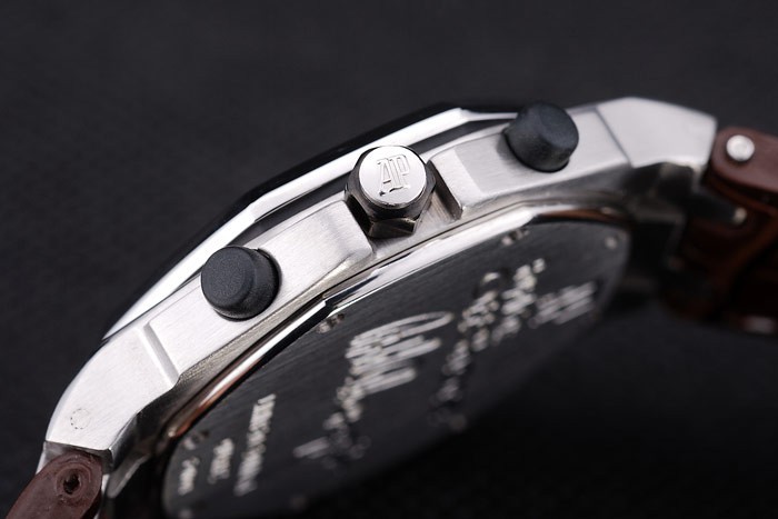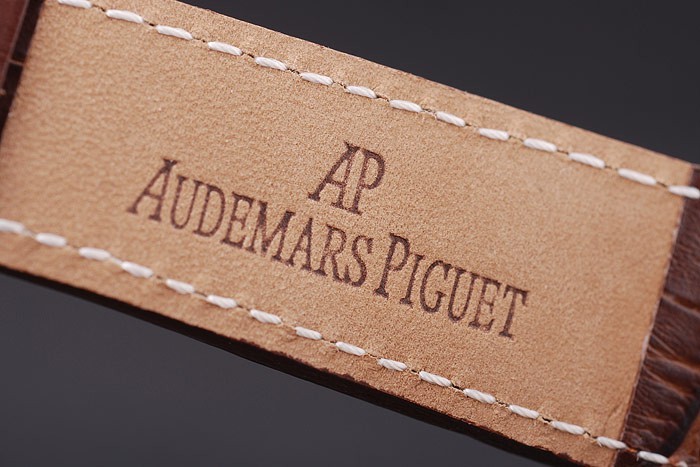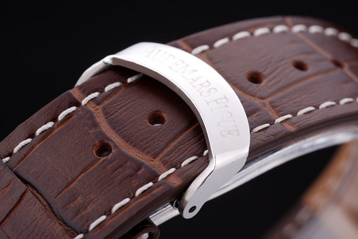 Bracelet: correa de piel de cocodrilo marrón oscuro con costuras de hilo blanco y el calor en relieve nombre de Audemars Piguet y el logotipo y un Audemars Piguet inscrito acero inoxidable flip-sobre el gancho clasp