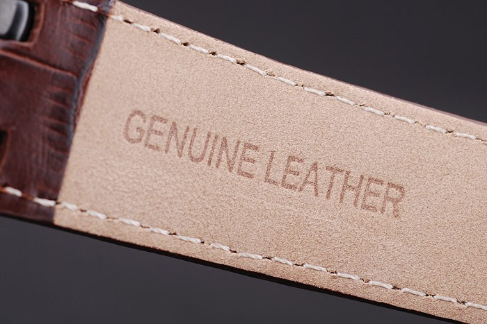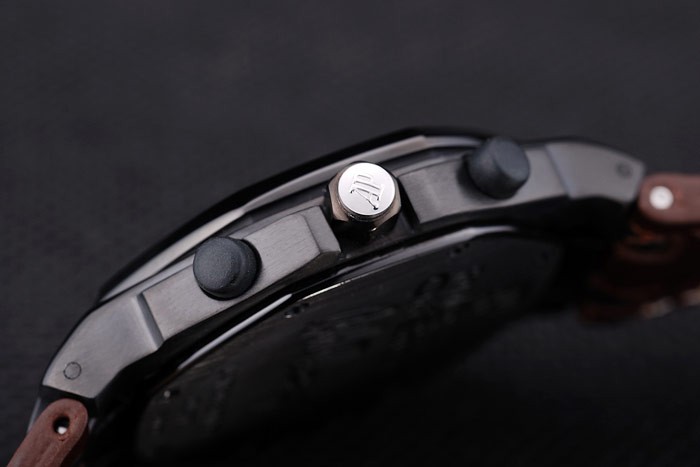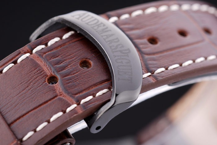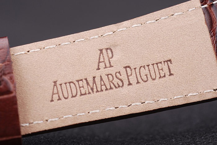 Bracelet de acero inoxidable: correa de piel de cocodrilo marrón oscuro con costuras de hilo blanco y el calor en relieve de relojes Piguet nombre y el logotipo y un Audemars Piguet inscrito ion-plateado flip-sobre el gancho clasp