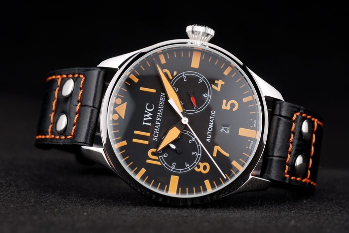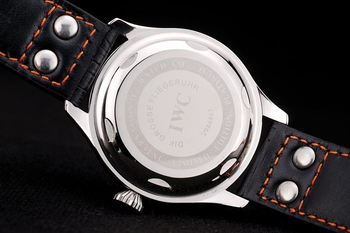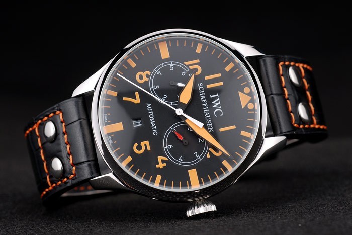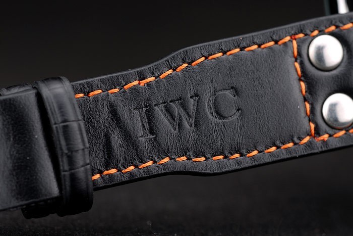 Bracelet acero inoxidable cepillado: Correa CBI calor en relieve de cocodrilo negro de cuero con hilo de coser de color naranja y grabado de acero inoxidable cepillado de gancho CBI clasp