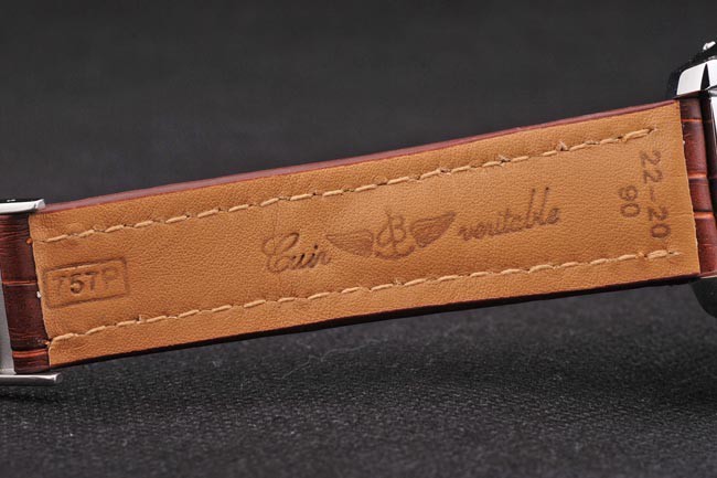 Bracelet 440-grado: caoba caliente piel de alta calidad de color en una patrón de cocodrilo, con las costuras de algodón pesado blanco. Tan banda interior está grabado con el nombre y el logotipo de Breitling, y tiene un cierre hebilla de acero.