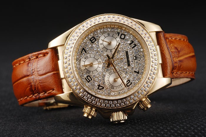 Crown: 18k corona amarilla calado de oro con el logotipo de Rolex y dos botones pulsadores cutwork coronas más pequeñas a cada lado de it